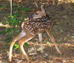 Baby deer found The public often assumes that a found fawn is "abandoned", when in fact they are behaving normally. Lying still and quietly by themselves is normal for young fawns. The first few weeks of it's life, a fawn has no scent so is not easily detected by predators if it lays still. It's mother is typically close by and feeds the fawn periodically but doesn't stay with her fawn(s) continuously, so as not to attract predators. This is a normal survival tactic. |