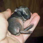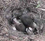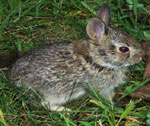 Cottontail outside of nest or abondoned If the bunny's eyes are open, out of the nest, and approximately the size of a fist (covers the palm of your hand), it is a self-feeder. Leave it alone. Sometimes bunny nests are damaged by machinery or predators. If the bunnies are still in the nest, they are not completely weaned. As soon as possible, restore the nest. If the nest has been disturbed for some undeterminable amount of time, it may be wise to check the babies for dehydration. If the bunnies are healthy, place them back and restore the nest. To check if the mother is coming back to feed the bunnies, place two pieces of string or yarn over the nest forming an x-mark and check back a couple of hours after sunrise or dawn. If the x-mark has moved, the mother has been there. If it has not moved, and if the bunnies feel cold to the touch, remove them and get in touch with a rehabilitator. If the babies look healthy, continue with the x-mark and wait until the next morning or evening to check back. Bunnies feed only three times a day as newborns, and at weaning the mother will only see them once every 24 hours. |