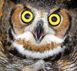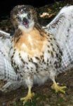 Raptors Raptors are carnivorous and they are well equipped for tearing flesh. A raptor must therefore be approached with the utmost care. Wearing protective clothing and heavy gloves is a must. It also helps to know the behaviors specific to the species. Hawks prefer to throw themselves on their back and defend themselves with their talons. Owls will use their beak as well as their feet. A vulture will want to peck, but also vomits as a means of defense. If the bird is on the ground, the easiest way to catch him is by pacing a cardboard box over him. A heavy blanket could also be used (wearing heavy gloves). Never try grabbing at him with your hands: someone will be hurt! It is always recommended that the caller find an experienced raptor rehabilitator to capture the bird. |